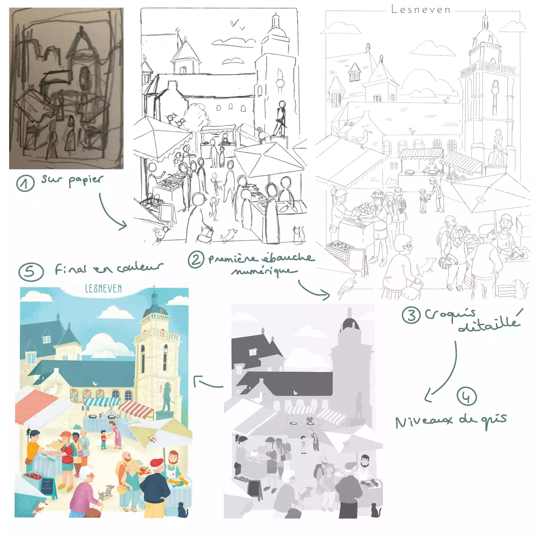 J’ai commencé par aller sur place un jour de marché, pour profiter d’une visite guidée. J’ai pris des photos et capturé l’ambiance. Dès que possible je vais voir les lieux « en vrai », cette étape enrichit considérablement le résultat !